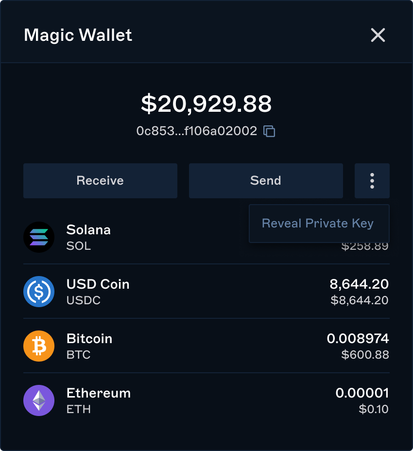 Your Magic Wallet address and private key