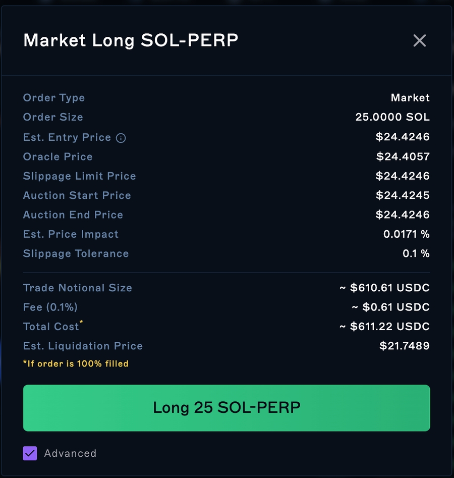 When you're ready to open the position, click the button at the bottom of the Trade form. A confirmation modal will appear so you can review the details of your trade and make sure all the details are correct before you continue. Finally, you will be asked to sign the transaction with your connected wallet.